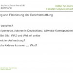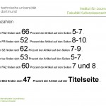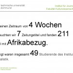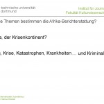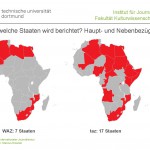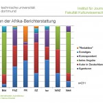 Studierende des Instituts für Journalistik der TU Dortmund haben über einen Zeitraum von vier Wochen die Berichterstattung über Afrika in sieben Zeitungen ausgewertet. Im Erhebungszeitraum vom 24. April bis zum 21. Mai 2013 wurden 211 Artikel mit Afrikabezug abgedruckt. Das Gros der Artikel ist in der FAZ, TAZ und der Welt erschienen. Themen, die in diesem Zeitraum die Berichterstattung dominierten, waren Krieg, Kriminalität, Krisen, Krankheiten und Katastrophen (5-K) sowie Politik. Lediglich acht Prozent der Berichte befassten sich mit wirtschaftlichen Themen. Im Bezugszeitraum wurde vornehmlich über Mali, Ägypten, Nigeria sowie Südafrika berichtet. Den Großteil der Berichte erstellten Agenturen und Autoren in Deutschland, nur 17 Prozent der Berichte wurden von Auslandskorrespondenten erstellt. Insgesamt spielte Afrika im Beobachtungszeitraum kaum eine Rolle in den beobachteten Medien.
