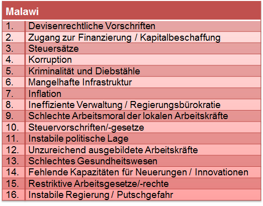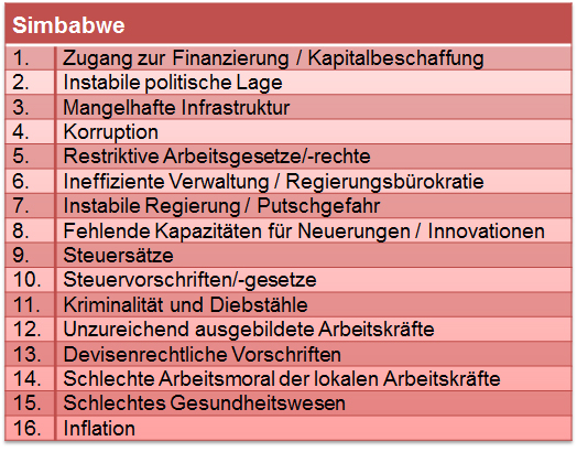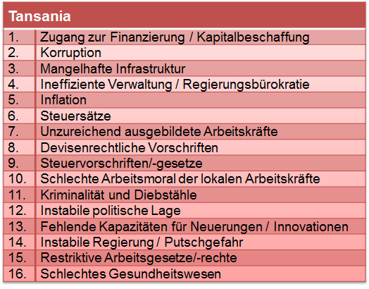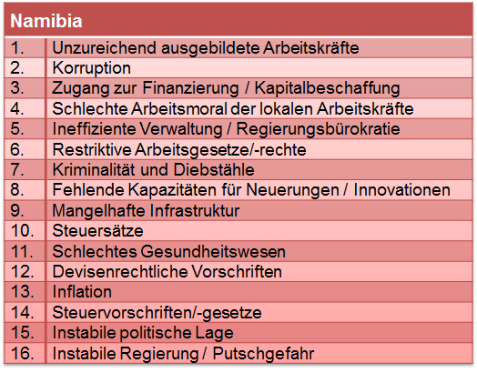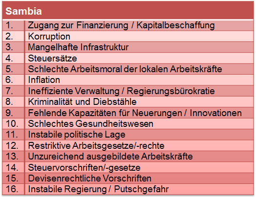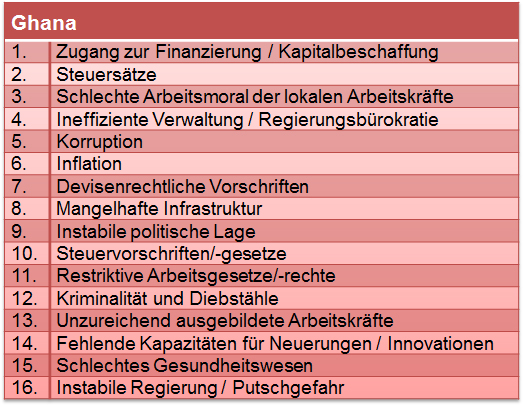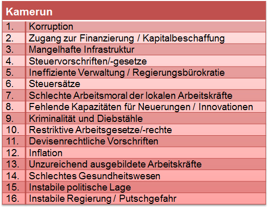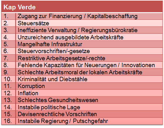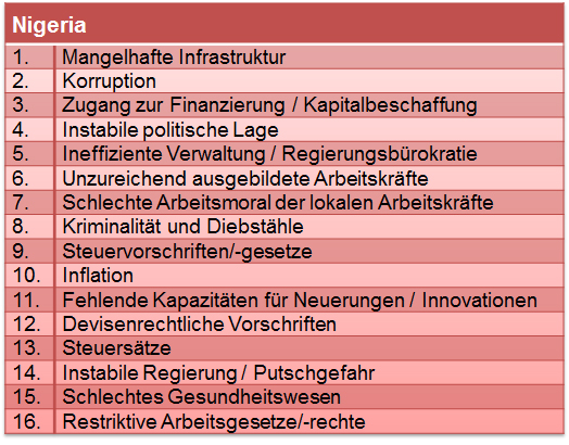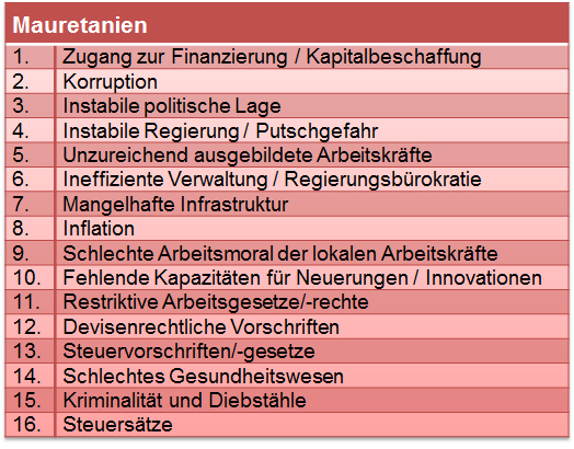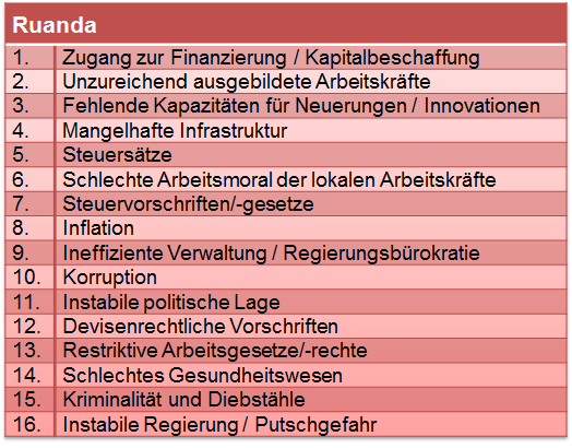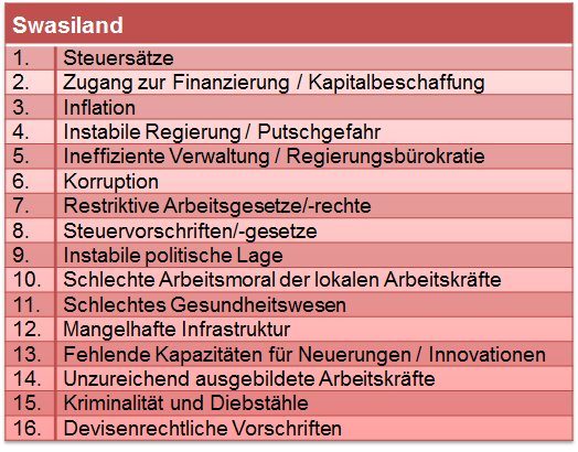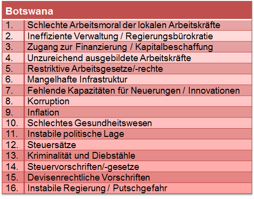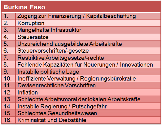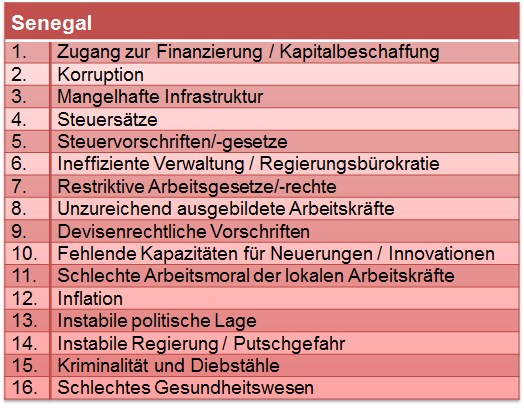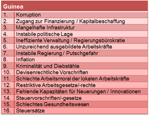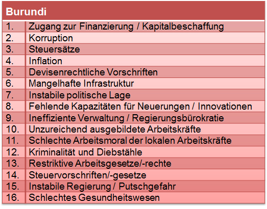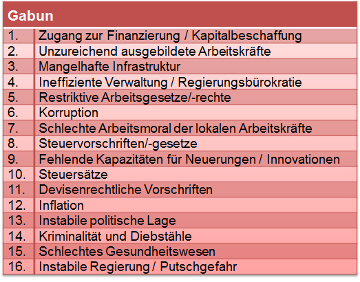 Die Länderübersichten zeigen Faktoren, die von lokalen Führungskräften als am hinderlichsten für eine Geschäftstätigkeit in ihrem Land angesehen werden. Die Angaben beruhen auf der „World Economic Forum’s Executive Opinion Survey 2013” des World Economic Forum. Die Teilnehmer der Umfrage haben aus 16 Kriterien die fünf problematischsten Punkte für ihr Land identifiziert. Die Ergebnisse wurden nach ihrer Antworthäufigkeit zusammengefasst und gewichtet (1 stärkste Ausprägung, 16 schwächste Ausprägung).