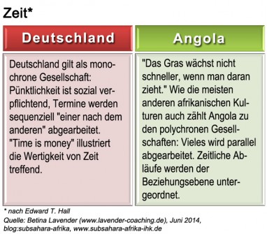 Lassen Sie mich mit einer kurzen Geschichte antworten: Ein deutscher Unternehmensvertreter, nennen wir ihn Herr Neumann, reist mit einem stringenten Terminplan in Angola an. Ein Fahrer empfängt ihn in Luanda und bringt ihn in den kommenden zwei Stunden durch den unglaublich dichten Verkehr zum Ort eines geschäftlichen Meetings. Dort muss er feststellen, dass seine Verhandlungspartner noch auf sich warten lassen. Eine weitere Stunde später erscheinen sie und ein ausführliches Begrüßungsritual beginnt. Kleine Geschenke werden ausgetauscht, man erkundigt sich nach der Familie, der Reise, der Lage in Deutschland und vielem mehr. Herr Neumann, bereits zwei Stunden hinter dem selbstgesteckten Zeitplan, wird immer nervöser. Ungeduldig besteht er darauf, endlich mit dem Meeting zu beginnen. Eine verlegene Stille entsteht.