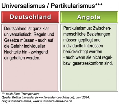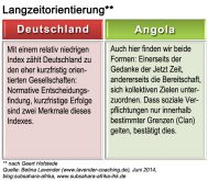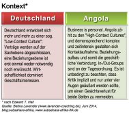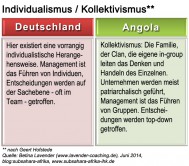 Angola gilt als kollektivistische Kultur, die eigene “in-group”, also der Clan, die Familie, genießt höchste Priorität. Verhandlungen finden auf der Beziehungsebene statt, wobei die sich daraus ergebenen Vorteile für den Clan als absolut vorrangig anzusehen sind. Zeit spielt eine Rolle als Statussymbol, d.h. um die eigene Wichtigkeit zu betonen. Zeitpläne oder Termine sind üblicherweise dem Beziehungsaufbau sowie der Beziehungspflege untergeordnet. Für Deutsche ist es häufig schwierig, die “Logik” hinter Entscheidungsprozessen zu ergründen, lassen sie sich doch in erster Linie durch Sachthemen und fachliche Argumente leiten. Auch die überaus flexible Zeitgestaltung durch die angolanischen Gastgeber führt häufig zu Unwillen, Stress und dem Eindruck mangelnder Wertschätzung. Insgesamt bestehen zwischen der angolanischen und deutschen Kultur so gut wie keine Gemeinsamkeiten.