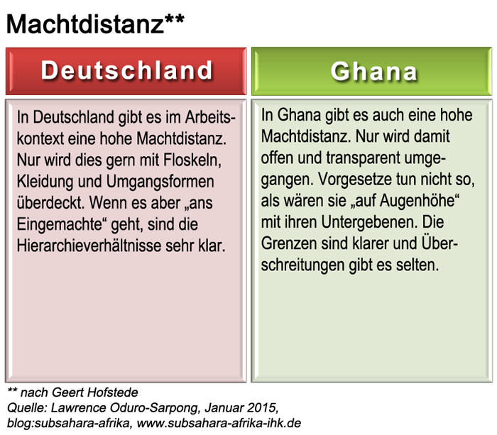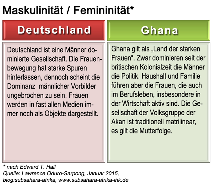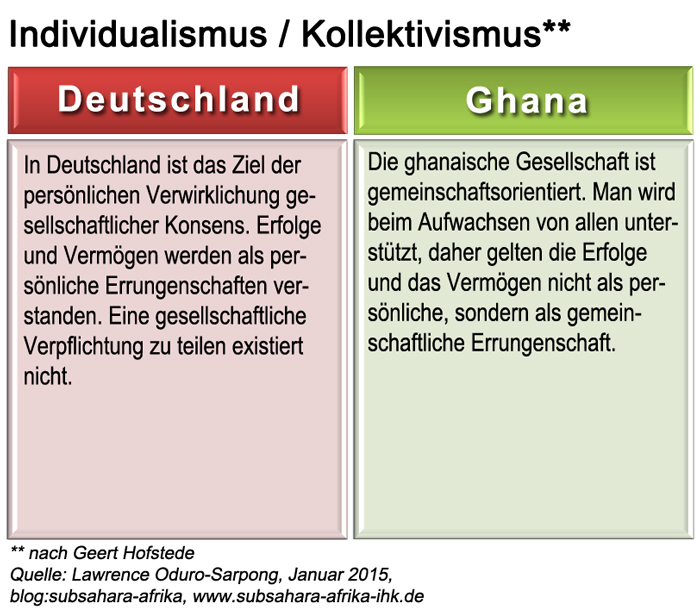 Deutsche und Ghanaerinnen und Ghanaer haben die Gemeinsamkeit, dass sie ihr Land mögen. Auch das „Chilling“ haben sie gemeinsam, indem sie nach Feierabend oder am Wochenende in die Bar oder Kneipe gehen, um mit Freunden etwas zu trinken. An Feiertagen unternimmt man gerne etwas, man veranstaltet ein Picknick oder man fährt an den See oder Strand um zu feiern. Unterschiede gibt es aber reichlich. Als spirituelles Volk nehmen es die Ghanaerinnen und Ghanaer sehr ernst mit der Religion, sei es mit dem Christentum, Islam oder anderen Religionen. Sonntags gehen auch junge Menschen zahlreich in die Kirche, während man in Deutschland eher Senioren und Kleinkinder antrifft. Auch bei Arbeitssitzungen wird in Ghana nicht selten vorher und nachher gebetet. Ghanaerinnen und Ghanaer sind harmonieorientiert, während Deutsche zur Schuld- und Problemorientierung neigen. Die Trennung von Männer- und Frauenrollen findet in der ghanaischen Gesellschaft auch bei Akademikerinnen Zustimmung, während sich die Rollen in Deutschland zunehmend vermischen.