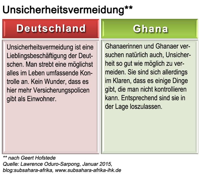 Da die Religion aufgrund der Spiritualität eine gewaltige Rolle gerade im Geschäftsleben der Ghanaerinnen und Ghanaer spielt, kommt es vor, dass zum Beispiel ein muslimischer Geschäftsmann eine Besprechung unterbricht, um pünktlich zur Gebetszeit zu beten. Dies stößt oft auf Unverständnis, lässt den deutschen Geschäftspartner an der Seriosität des ghanaischen Partners zweifeln und führt zu Ärger. Wenn in einem von einem Deutschen und einem Ghanaer geführten Unternehmen etwas schief läuft, kommt es oft vor, dass sich der deutsche Partner darum bemüht, die Schuldigen für das Scheitern zu identifizieren, um das Problem zu klären, während sein ghanaischer Partner den Blick nach vorne richtet, um die Zukunft besser zu gestalten und auch für eine gute Arbeitsatmosphäre zu sorgen. Eine solche Situation kann dazu führen, dass der Deutsche seinem ghanaischen Partner misstraut, während der Ghanaer sich darüber ärgert, dass es seinem deutschen Partner nicht wichtig ist, dass eine harmonische Atmosphäre im Unternehmen herrscht.