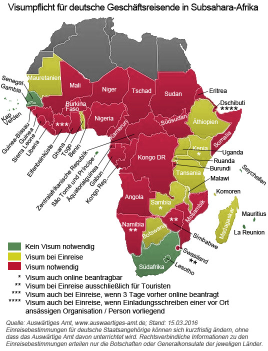 Laut “Visa Restrictions Index 2016” genießen deutsche Staatsbürger weltweit die größte Reisefreiheit. Sie dürfen in 177 der im Index dargestellten 218 Länder reisen, ohne ein Visum zu benötigen. Unter anderem gewähren Südafrika, Lesotho, Gambia, der Senegal und die Inselstaaten Mauritius, La Reunion, die Seychellen sowie São Tomé und Príncipe Deutschen Visafreiheit. Hingegen verlangen 30 Staaten südlich der Sahara von Deutschen ein Visum, so etwa Angola, Ghana, Namibia, Nigeria, Mosambik und die Elfenbeinküste. Zwölf dieser Länder ermöglichen die Beantragung eines Visums bei der Einreise an ihren Flug- oder Seehäfen bzw. an ihren Grenzen.